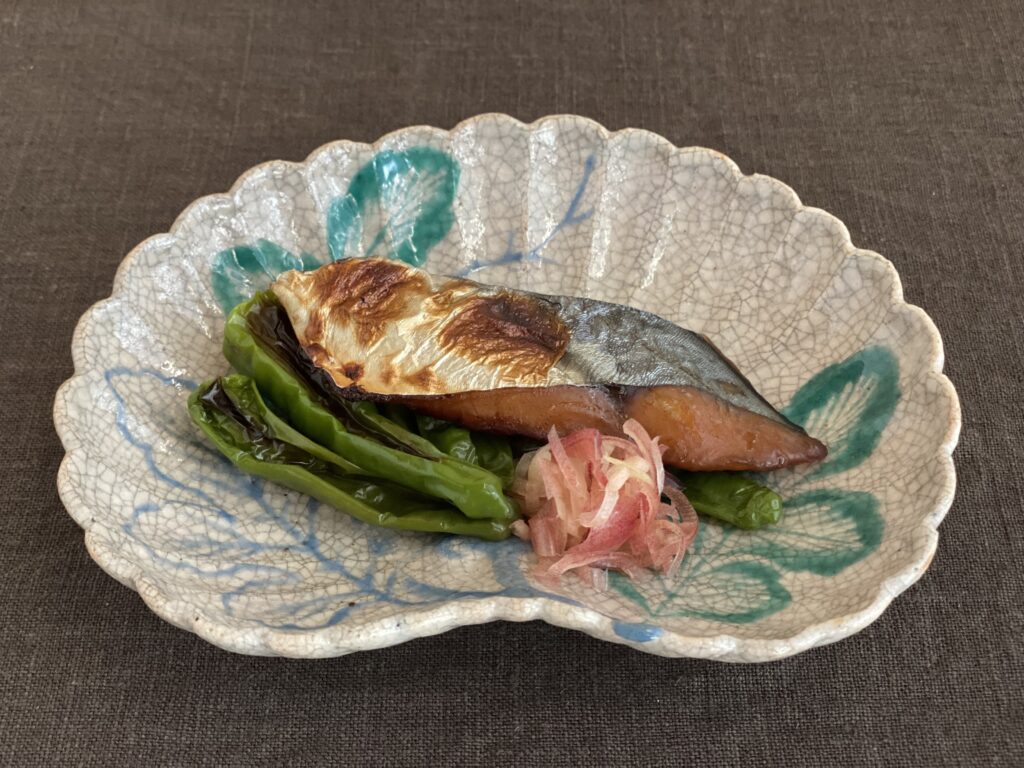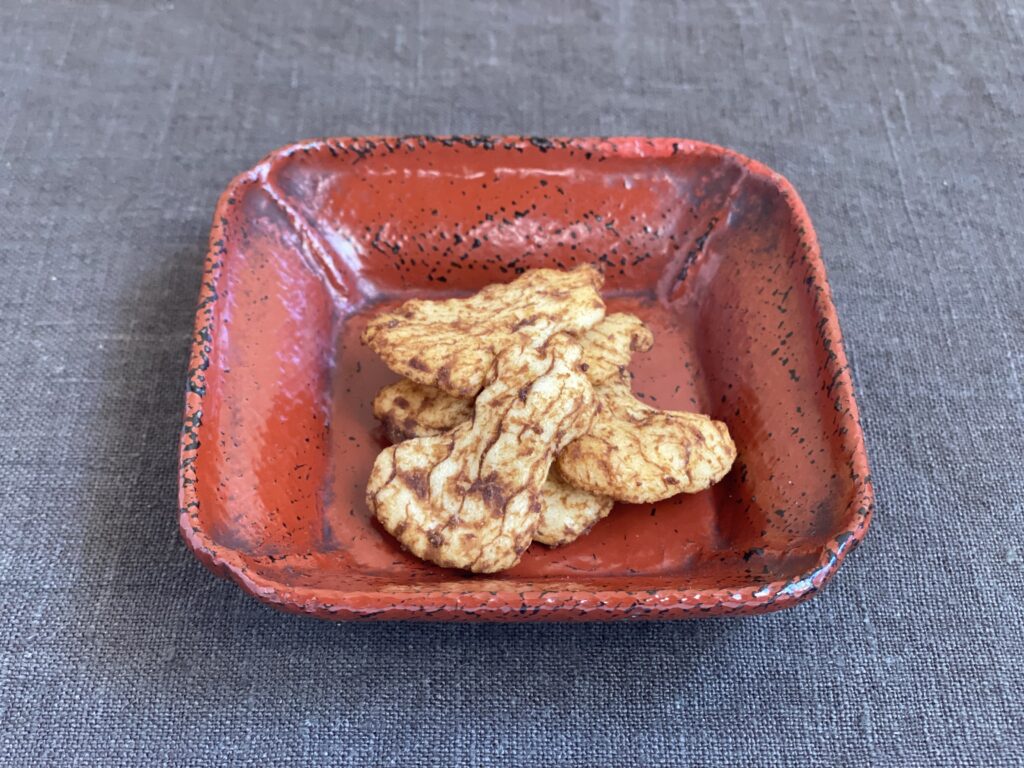 とある。確かに植物性調味料だけではない味の深味が有り、形も味も贅沢なお煎餅だった。何を載せたら素敵かしらと考えていた、この朱の張貫が思い浮かんで盛ってみた。
