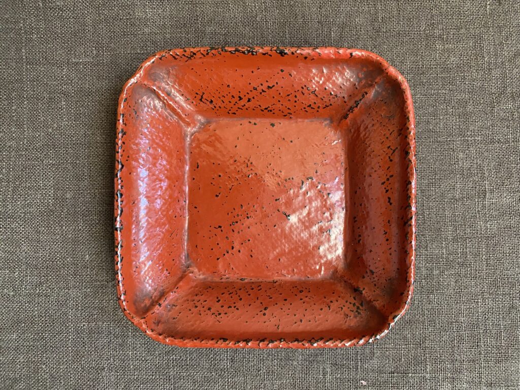 生地の上に何層の漆を掛けてあるのだろう。中塗りの黒漆の上に上塗りで朱の漆を掛け、削って所々に下の黒漆が覗く、いわゆる根来の手法だ。生地の紙のざらざらした質感は、漆を何層も塗り重ねても残っているし、その凹凸が黒色が覗く様を作り出す。素朴でありながら造形は几帳面で、一体感が有り品格を感じる。裏の四角い高台の中は朱を掛けずに黒。使う時、裏は見えないけれどこの皿をきりっと引き締めている。