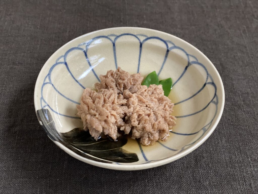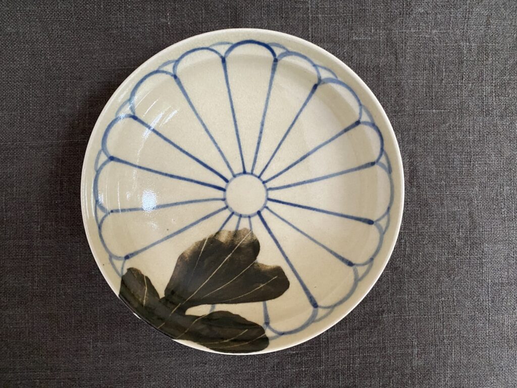 たらこは岩倉焼の菊の小皿に盛った。皿いっぱいに具象的な菊が呉須で描かれ、鉄釉で一枚、大きめの葉がのぞく。細い均一な線描きの菊に対して、葉は筆の面を使った濃淡で絵画的に表現されている。釘で鉄釉を削ぎ取った線によって葉脈が表現されている。菊の花だけだと紋章のように感じるけれど、この葉の表現はとても柔らかく、生きている植物を感じる。花と葉の対照的な表現が同居して、不思議な雰囲気を作っている。